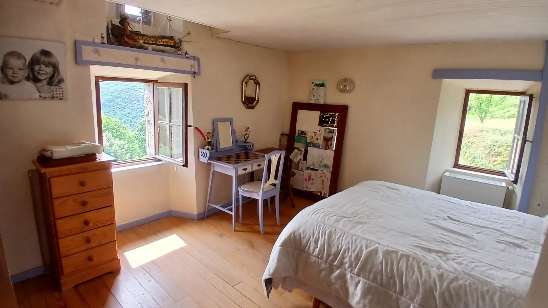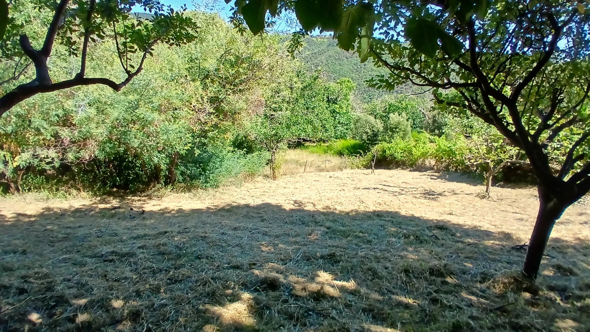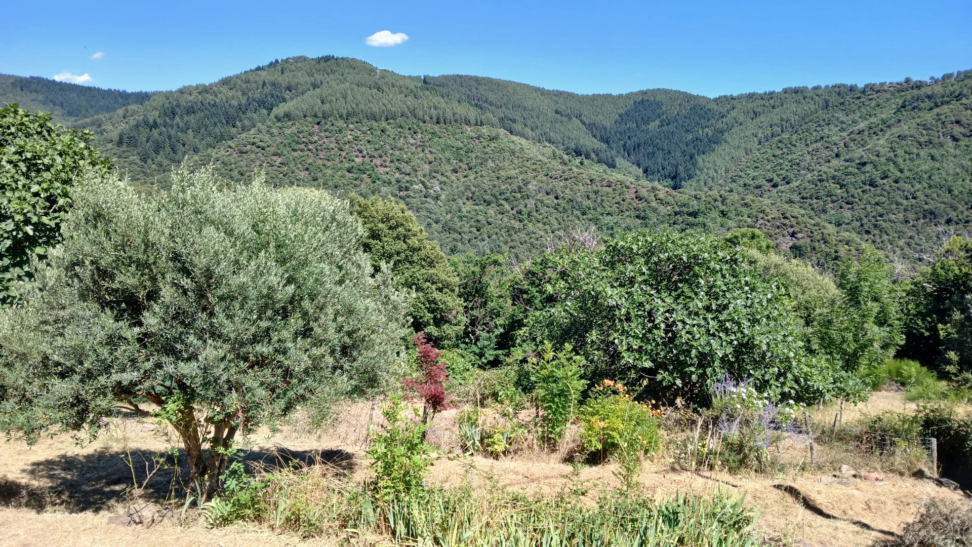 Dans un hameau au clame, Une pièce à vivre de 28 m² avec un insert, 2 chambres de 13 et 11 m² et un bureau de 7 m², salle de bains toilettes, terrasses, Une clède à rénover et cave. Sur plus de 3 hectares de terrain en grande restanques plates et accès à la rivière par la châtaigneraie. Accès en voiture.